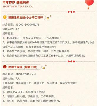隔膜涂布和小分切工程师工资(1.3-2万),隔膜班组长(0.9-1.2万),工艺操作工(0.8-0.85万),质检员(0.63-8.5万),包装工(0.8-0.85万),破碎工(0.8-0.85万),清洗工(0.8-0.85万),投料工(0.6-0.8万)辅料员(0.53-0.6),仓库管理员(0.52-0.6),叉车工(0.6-0.95万),辅助工(0.53-0.6万)