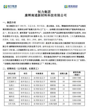 康辉南通新材料科技有限公司(简称康辉南通)是世界500强企业恒力集团旗下恒力石化股份有限公司-康辉新材料科技有限公司的全资子公司,康辉南通2022年启动建设,坐落于江苏省南通市,占地面积1700亩,人员编制预计达4300人。康辉南通依托康辉新材多年聚酯薄膜研发生产经验及自主研发的纳米级功能性母料专有技术,引进行业领先的德国布鲁克纳拉膜技术装备与日本芝浦机械先进生产线及配套设备,建设高端薄膜与锂电池隔膜项目。项目建成后将年产50万吨功能性BOPET聚酯薄膜、10万吨功能性薄膜及30亿平方米锂电池隔膜。2025年入选国家工信部发布的《2025年5G工厂名录》,“全链路云端协同的功能性薄膜5G智能制造工厂”项目榜上有名。